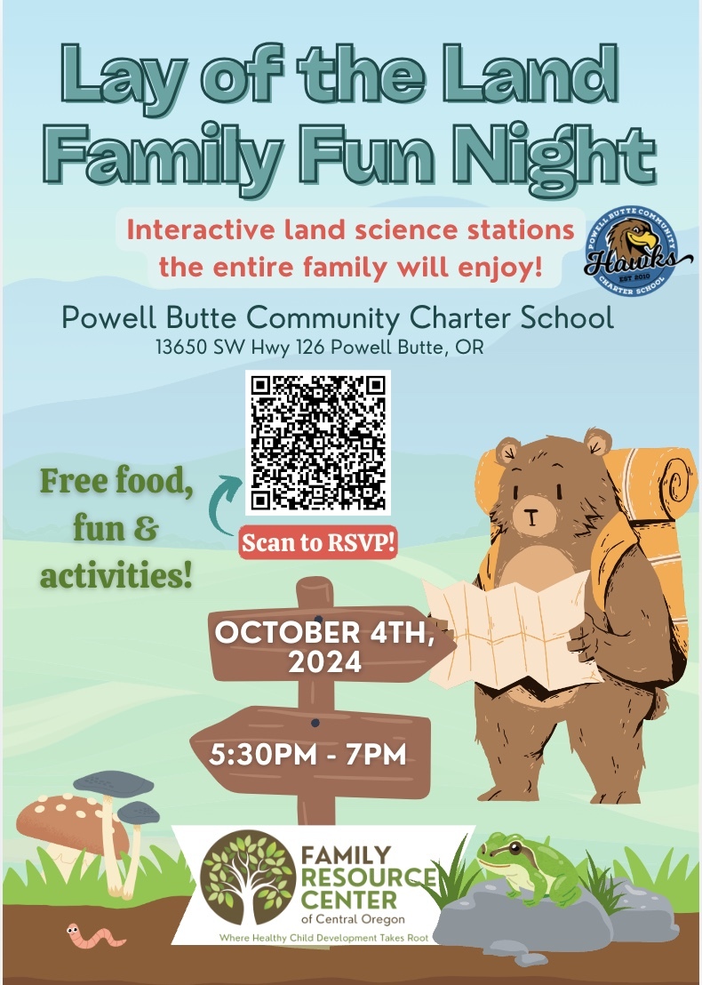 We invite all students and their families of Powell Butte Community Charter School to join us for a night of fun, land centered activities. Dinner will be served. Scan the QR to RSVP today!