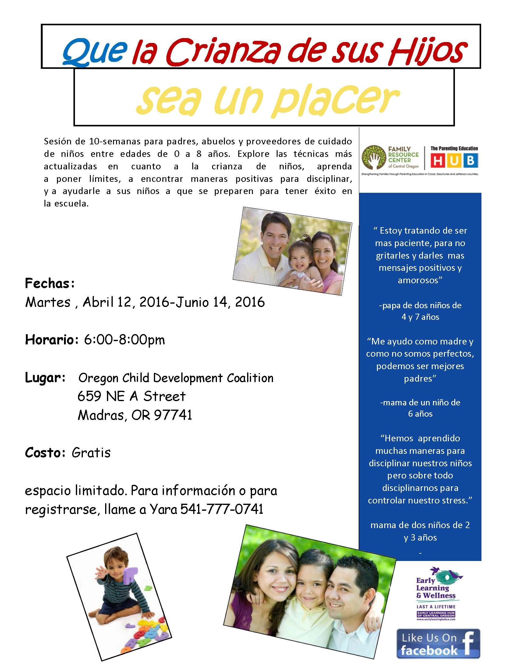 Sesión de 10-semanas para padres, abuelos y proveedores de cuidado de niños entre edades de 0 a 8 años. Explore las técnicas más actualizadas en cuanto a la crianza de niños, aprenda a poner límites, a encontrar maneras positivas para disciplinar, y a ayudarle a sus niños a que se preparen para tener éxito en la escuela.